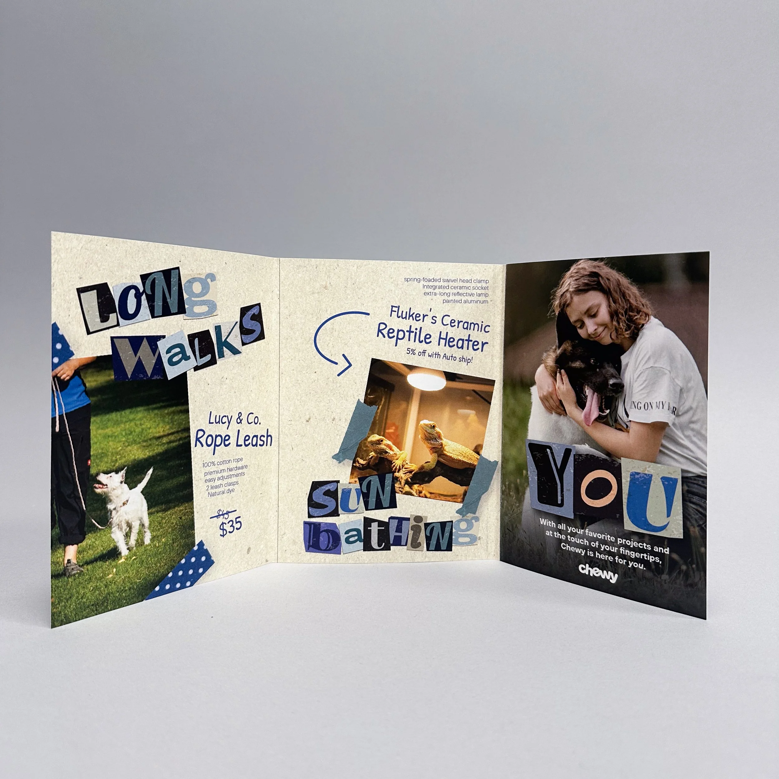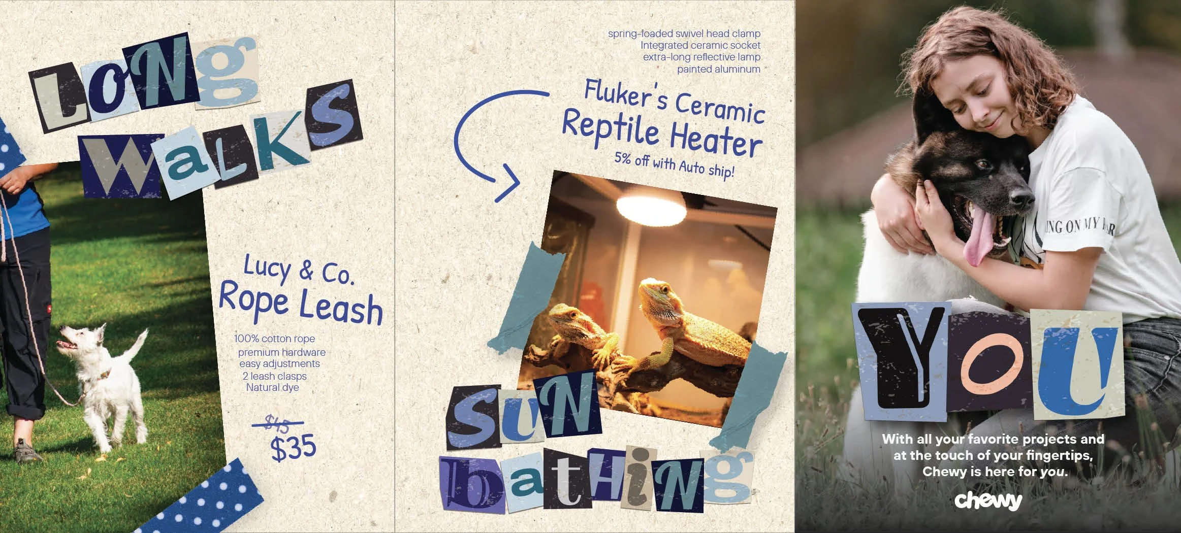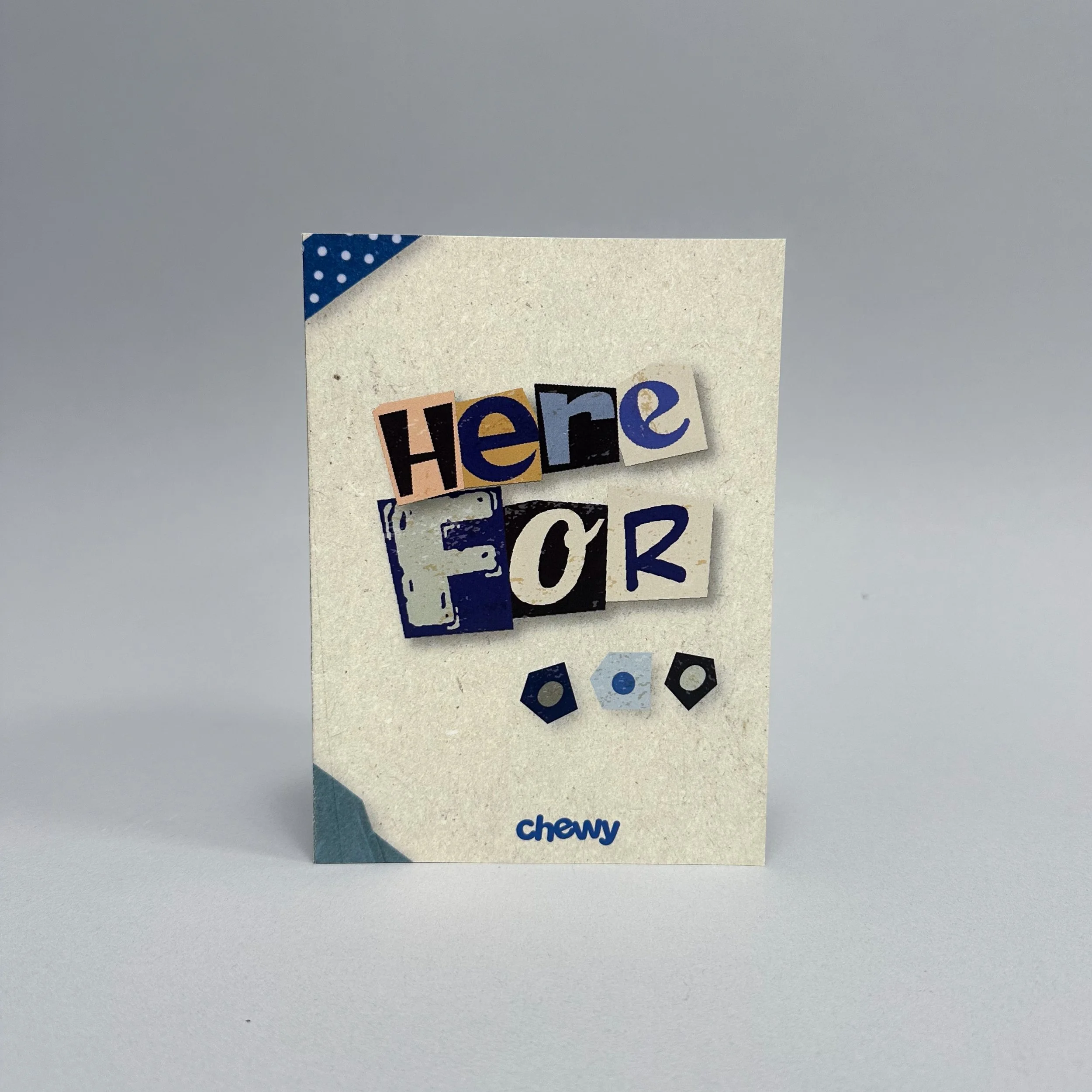 Inspired by the nostalgia that pets hold, the Here for You campaign was created to highlight the superior customer service at Chewy. The pet care brand is known for its handwritten notes that support clients. To enhance what the brand already stands for, a slogan and scrapbook-style design were created.