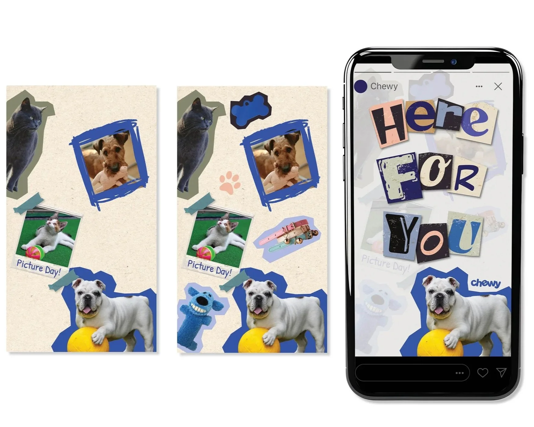 The video storyboard used a scrapbook to tell the story of a pet’s life and how Chewy supported the dog. Then, the Here for You slogan was adapted to show viewers moments where Chewy helped.