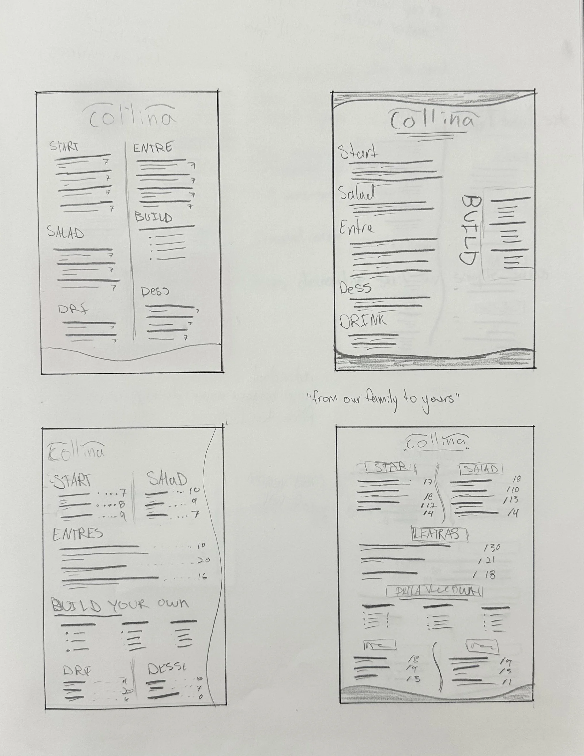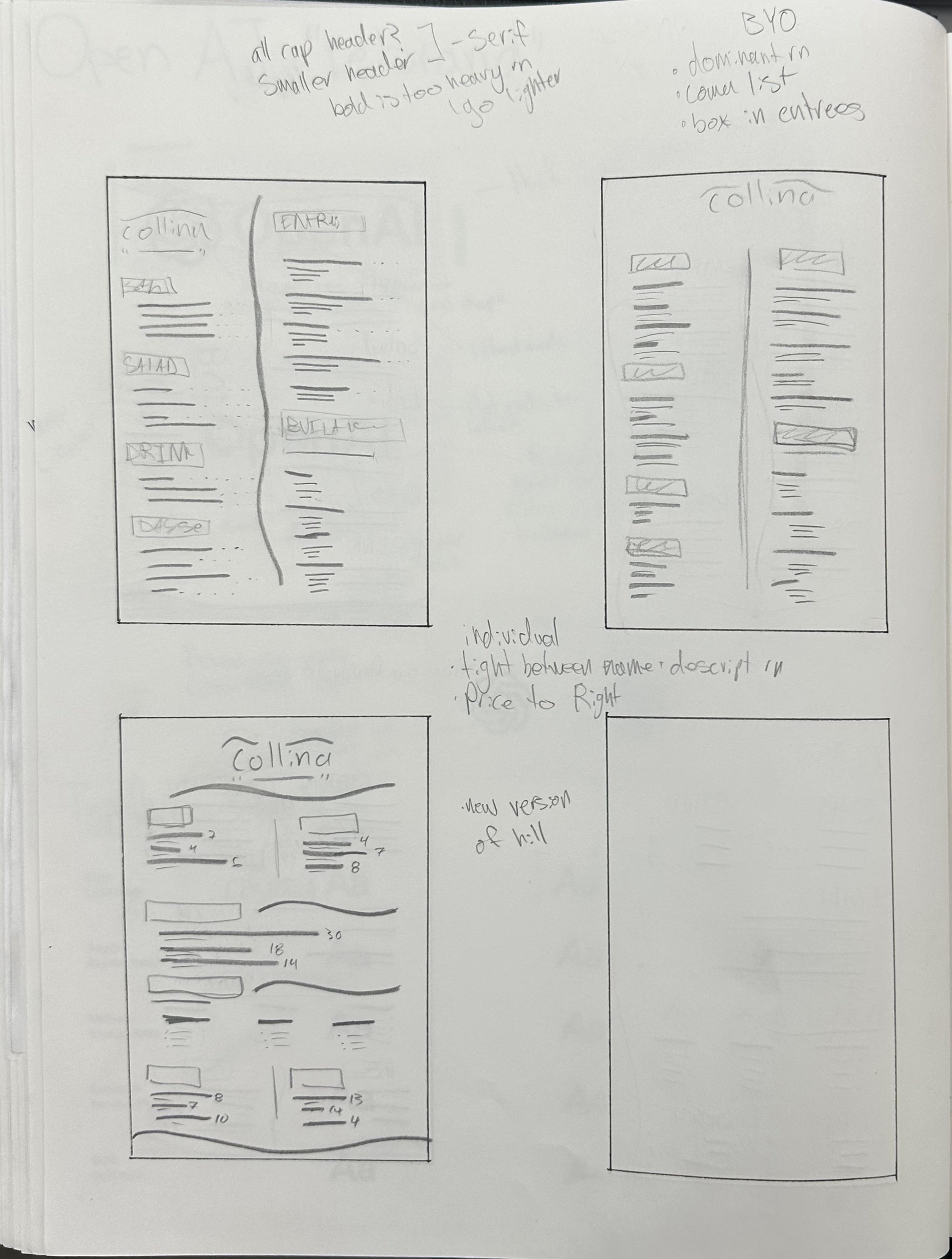Next, a menu was designed using knowledge of type hierarchy. The typeface from the logo is continued to create cohesion, while a sans-serif typeface is added for legibility and contrast. The rolling hill motif is further continued in the center of the menu to act as a divider and again at the bottom of the page to ground the design.