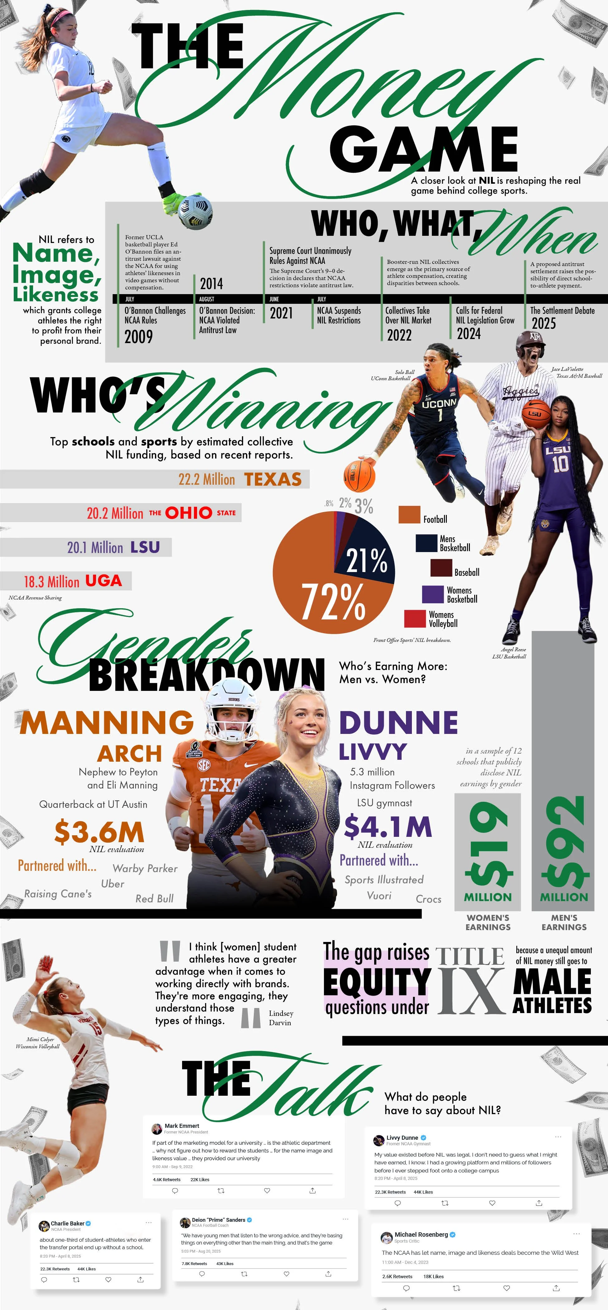 Breaking up the graphic with subtle dividers and charts helped create a dynamic eye flow while sectioning off areas. History was provided to create a backdrop, comparisons of universities helped set a competitive groundwork, and a section detailing the gap in female and male compensation added modern commentary. The infographic concludes with quotes from Advocates and leaders in the NIL industry in the shape of tweets to represent how social media plays into the world of NIL.